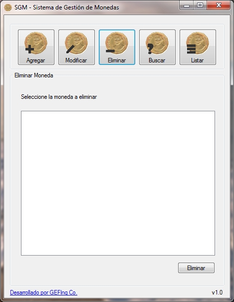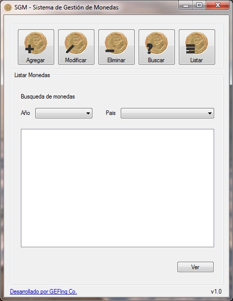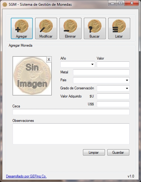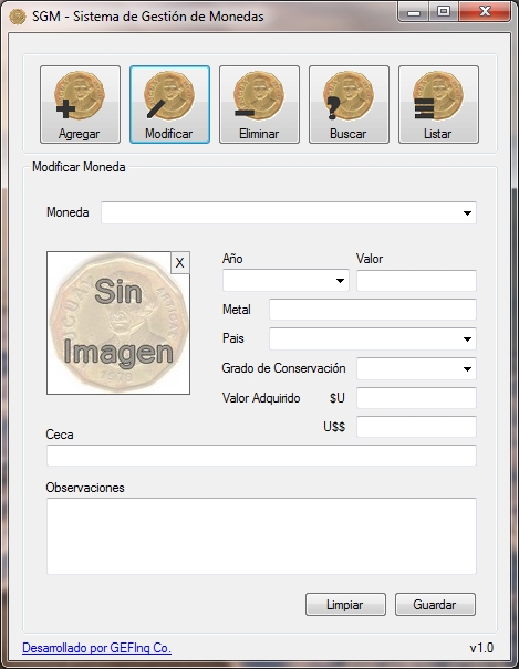 Herramienta capaz de agregar, modificar, eliminar, buscar y listar datos de monedas con la finalizar de facilitar el registro de ejemplares de coleccionistas.